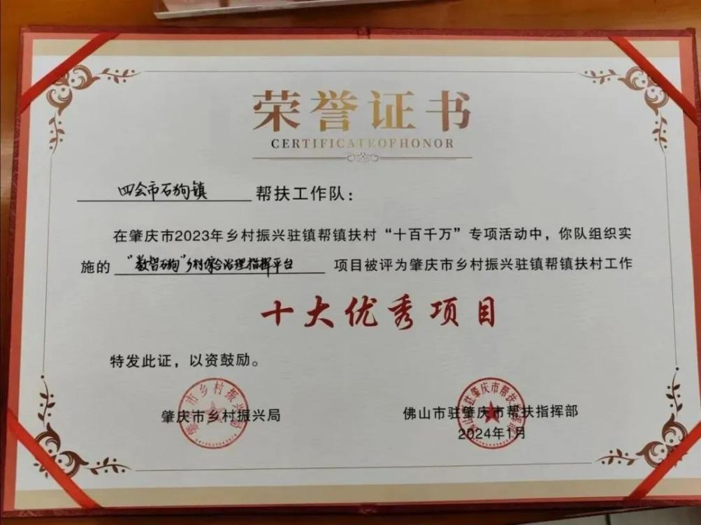 1月12日上午,广东省乡村振兴驻四会石狗镇帮扶工作队带着“数智石狗”乡村综合治理指挥平台项目,参加了肇庆市2023年乡村振兴驻镇帮镇扶村“十百千万”专项活动十大品牌项目市级评选活动,该项目最终顺利通过四会市的项目筛选,进入肇庆市的20个参选项目之一,并荣获肇庆市十大优秀项目证书。